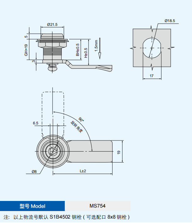 特征说明材质:锌合金基座、锁芯、碳钢钢栓 表面处理:镀亮光铬基座、锁芯、镀白锌钢栓 结构说明:把手旋转 90°实现开启或锁闭