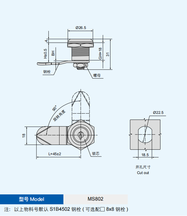 特征说明材质:锌合金基座、锁芯、碳钢钢栓 表面处理:镀亮光铬基座、锁芯、镀白锌钢栓 结构说明:90°旋转实现开启或锁闭 备注:默认配 K050 钥匙
