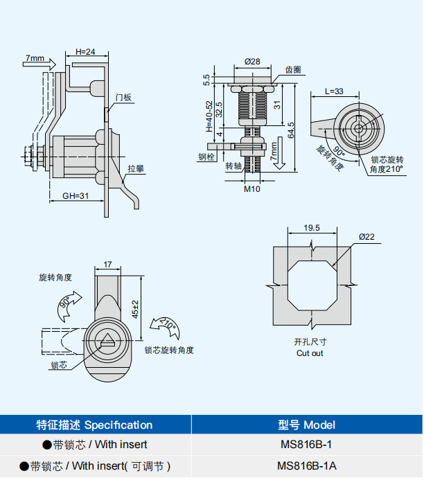 特征说明材质:304 不锈钢基座、锁芯及钢栓PA拉攀 表面处理:亮面处理 结构说明:钢栓 90°旋转实现开启或锁闭具有锁紧功能