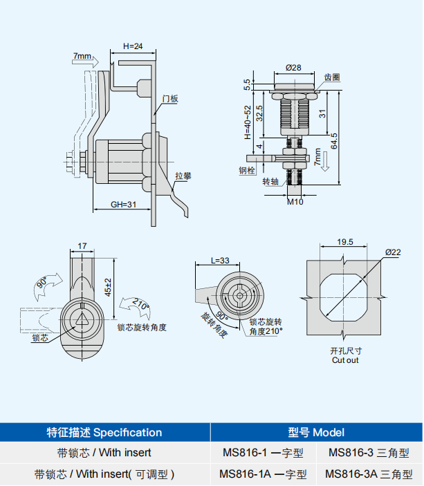 特征说明材质:锌合金基座、锁芯,碳钢钢栓,PA拉攀 表面处理:喷塑 ( 黑或镀亮铬 ) 基座、锁芯,镀白锌钢栓 结构说明:钢栓 90°旋转实现开启或锁闭,具有锁紧功能