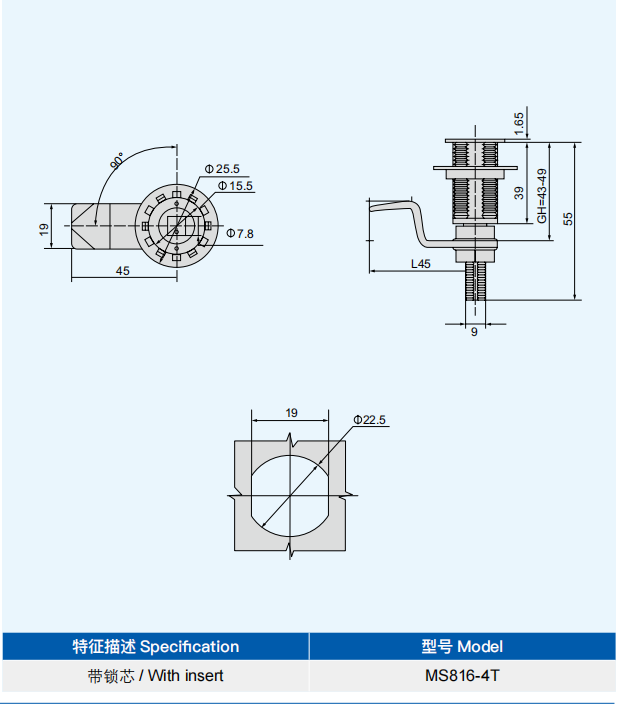 特征说明材质:锌合金基座、锁芯,碳钢钢栓,PA拉攀 表面处理:喷灰 ( 黑或镀亮铬 ) 基座、锁芯,镀白锌钢栓 结构说明:钢栓 90°旋转实现开启或锁闭,具有锁紧功能 备注:选配 K7030 钥匙