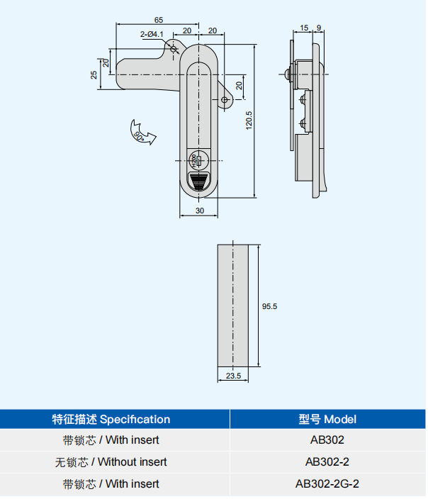 特征说明材质:锌合金基座、锁芯,碳钢钢栓 表面处理:镀沙铬基座、把手,镀白锌钢栓 结构说明:90°旋转实现开启或锁闭 备注:默认配 K0200 钥匙 适用门板厚度:1-4mm