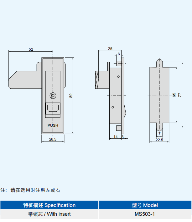 特征说明材质:锌合金基座、锁芯、按钮,碳钢钢栓 表面处理:镀白锌钢栓 结构说明:快速开启,安装方便快捷;通过钢栓打弯适用于不同的止口高度 备注:默认配 K0510 钥匙 适用门板厚度:1-4mm