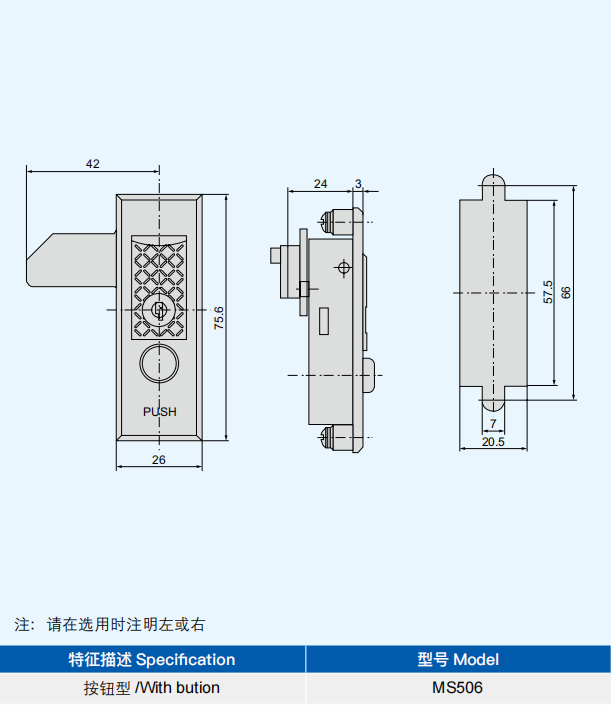 特征说明材质:锌合金基座、锁芯、按钮,碳钢钢栓 表面处理:镀白锌钢栓 结构说明:快速开启,安装方便快捷;通过钢栓打弯适 用于不同的止口高度 备注:默认 K0510 钥匙 适用门板厚度:1-4mm