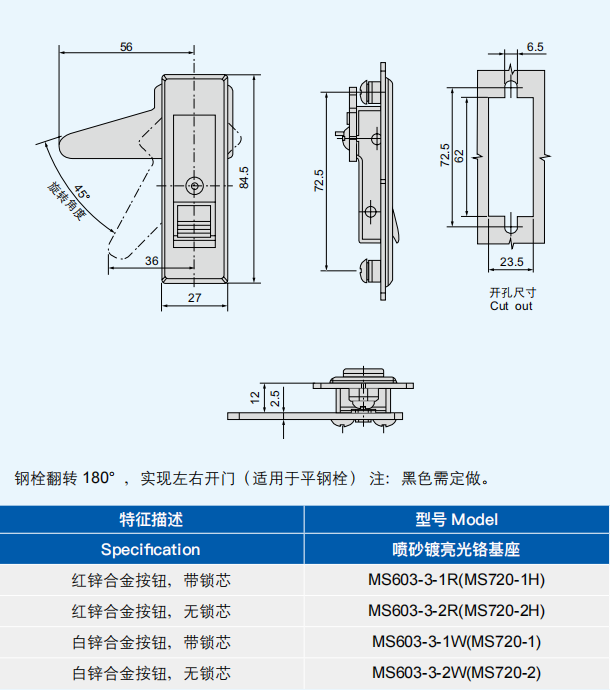 特征说明材质:锌合金基座、锁芯,锌合金按钮或 PA 按钮,碳钢钢栓 表面处理:镀白锌钢栓 结构说明:快速开启,安装方便快捷;通过钢栓打弯适用于不同的止口高度
