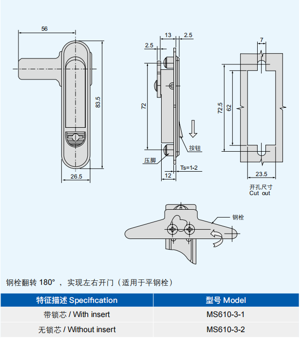 特征说明材质:锌合金基座、手柄、按钮,碳钢钢栓 表面处理:镀沙铬基座、手柄、按钮,镀白锌钢栓 结构说明:快速开启,安装方便快捷;通过钢栓打弯适用于不同的止口高度