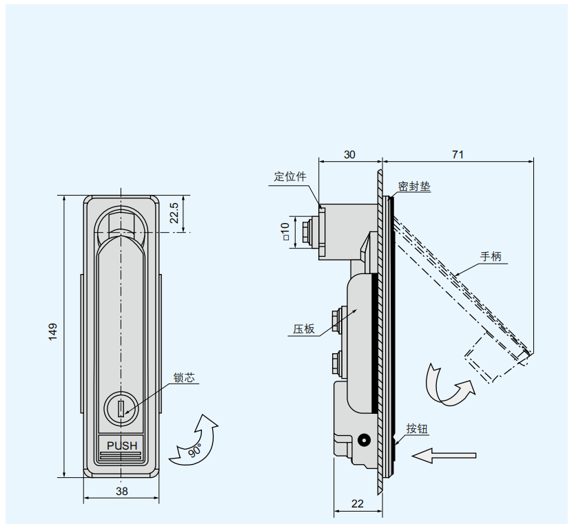 材质:锌合金基座、手柄、锁芯,碳钢压板、钢栓
