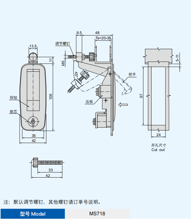 特征说明材质:锌合金基座、手柄、锁芯按钮,碳钢螺钉 表面处理:喷塑(黑淡光)基座、手柄、按钮,镀白锌 螺钉 结构说明:快速开启,安装方便快捷;调节螺钉可适用 各种间距范围 备注:默认配 K180 钥匙
