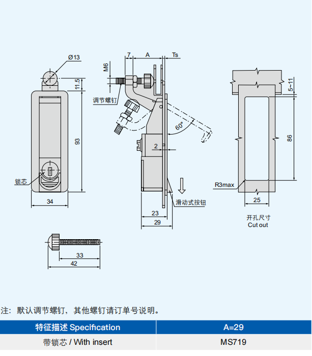 特征说明材质:锌合金基座、手柄、锁芯、按钮,碳钢螺钉 表面处理:亚光或喷塑(黑淡光)基座、手柄、锁芯、按钮, 镀白锌螺钉 结构说明:快速开启,安装方便快捷;调节螺钉可适用 各种间距范围 备注:默认配 K020 钥匙