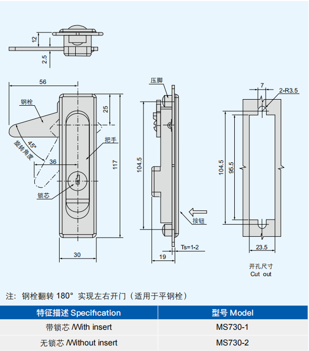 特征说明材质:锌合金基座、锁芯、按钮,碳钢钢栓 表面处理:镀白锌钢栓 结构说明:快速开启,安装方便快捷;通过钢栓打弯适 用于不同的止口高度 备注:默认配 K200 钥匙