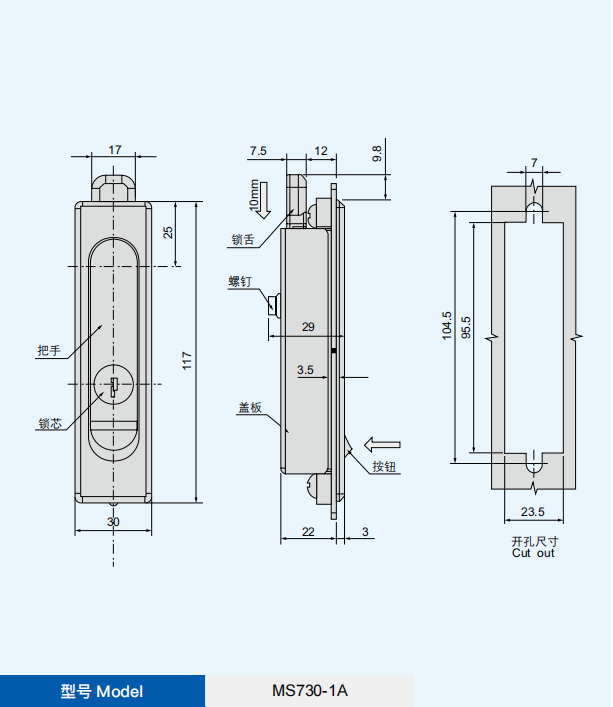 特征说明材质:锌合金基座、锁芯、按钮、碳钢钢栓 表面处理:镀白锌钢栓 结构说明:快速开启,安装方便快捷;锁舌前伸,适用 于特定的门框结构 备注:默认 K200 钥匙