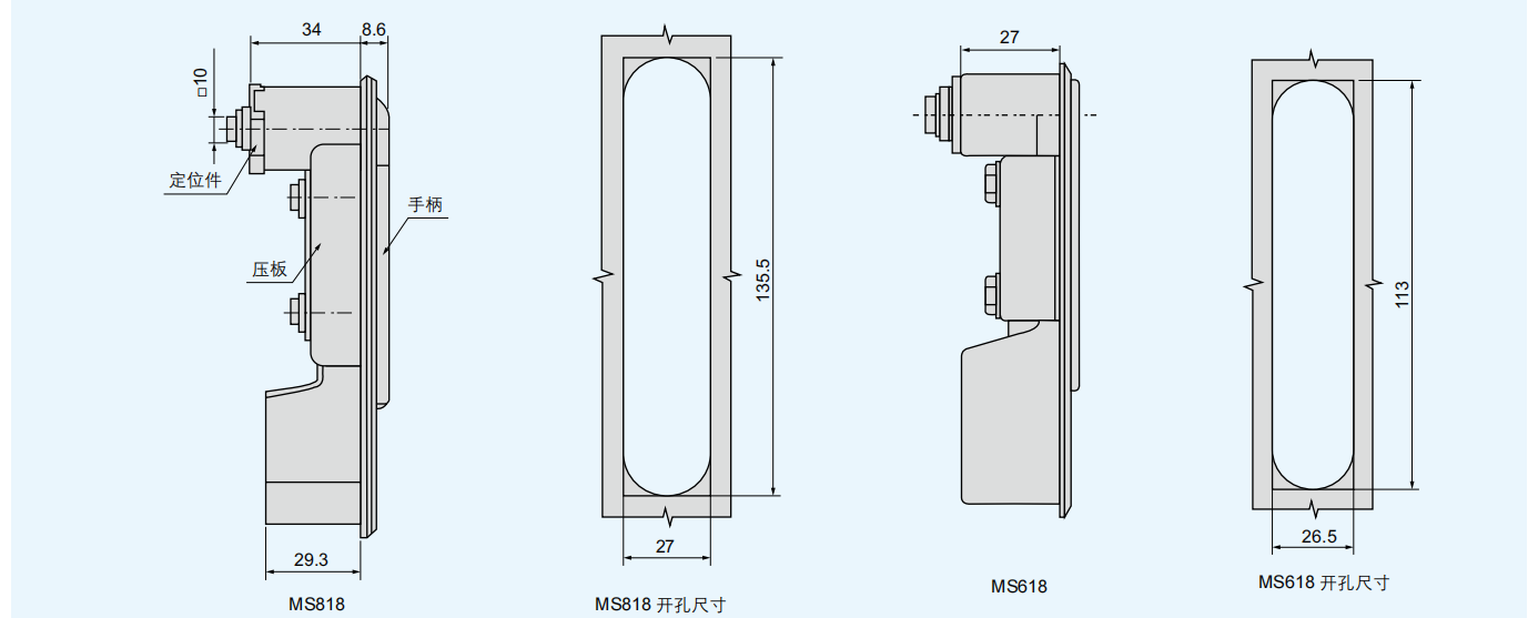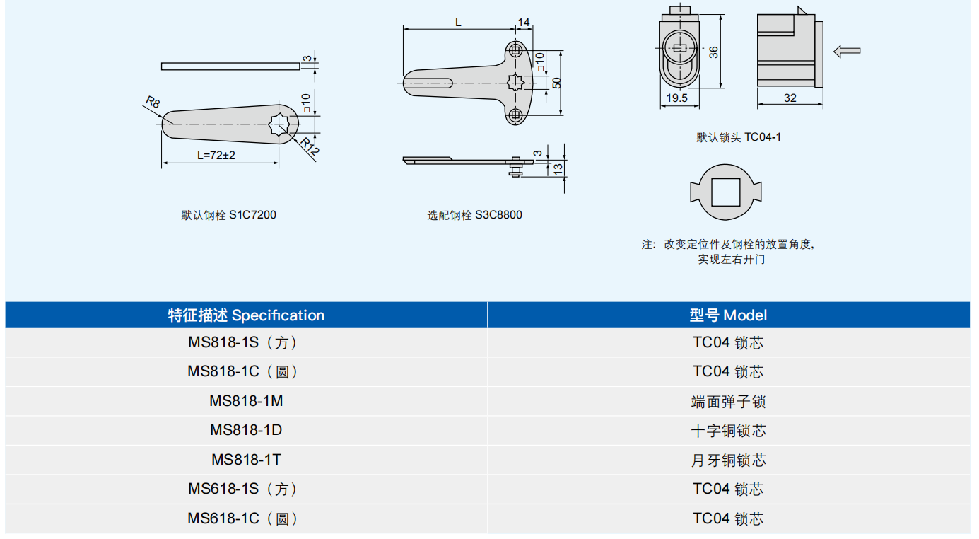 特征说明 材质:铝合金基座、手柄和锁头组件,碳钢压板、钢栓 表面处理:亚光或喷塑(黑淡光)基座、手柄、镀亮光铬锁头组件,镀白锌压板、钢栓 结构说明:快速开启,安装方便快捷;更换钢栓可达到单点与三点锁住功能