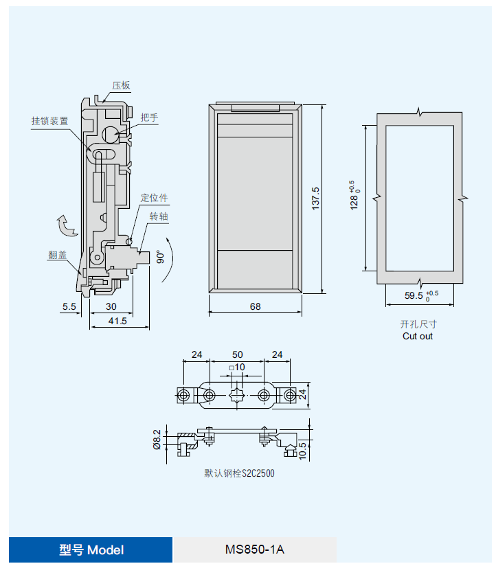 材质:铝合金基座、手柄、盖板,锌合金挂锁装置,碳钢钢栓、压板、转轴