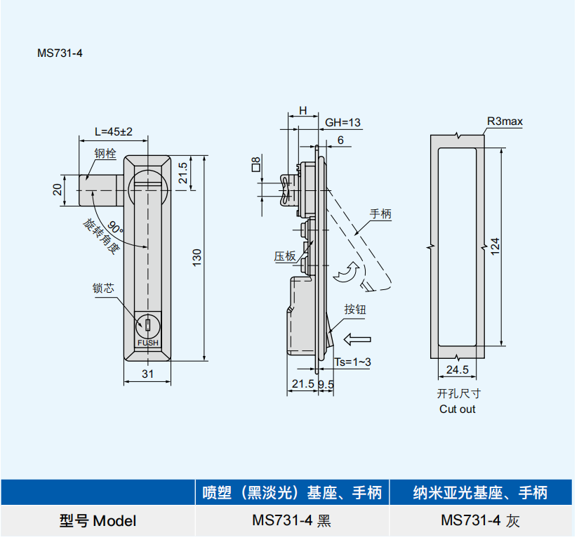 特征说明材质:锌合金基座、把手、按钮、传动壳,碳钢钢栓、 传动条表面处理:镀白锌钢栓结构说明:快速开启,安装快捷方便手柄 90°旋转带 动传动壳组件实现开启或锁闭备注:默认配 K060 钥匙