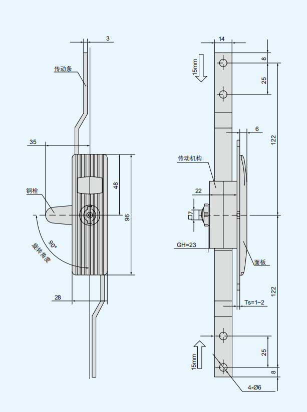 特征说明材质:锌合金锁芯、ABS 面板,碳钢钢栓、传动条, PA 传动壳 表面处理:纳米亚光面板、锁芯,镀白锌钢栓 结构说明:90°旋转实现开启或锁闭 备注:选配 K15-1 钥匙