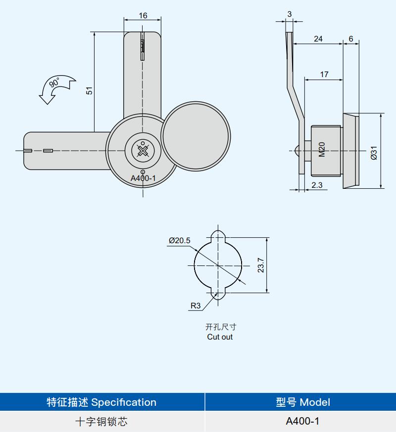 结构说明:钥匙旋转 90°实现开启或锁闭