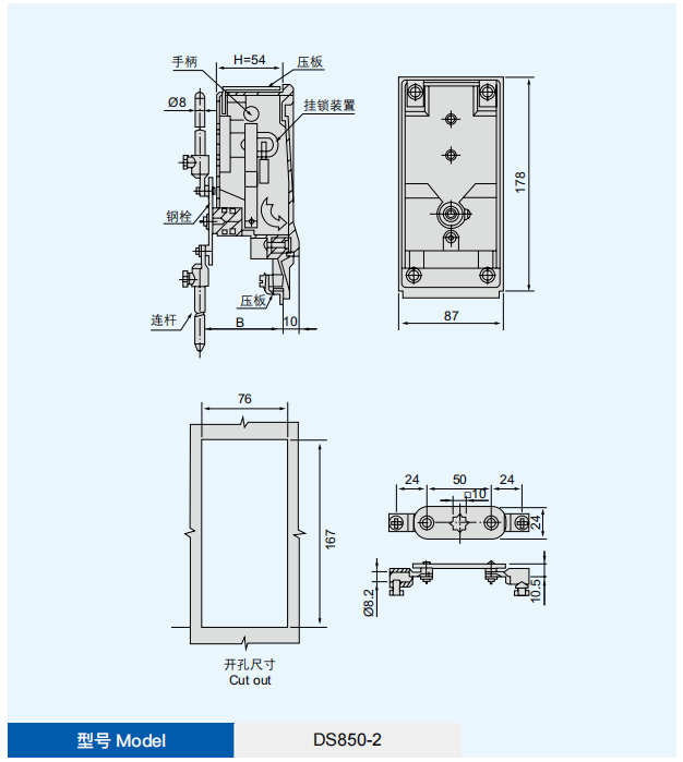 特征说明材质:铝合金基座、手柄、盖板,锌合金挂锁装置,碳 钢钢栓、压板、转轴 表面处理:喷塑(蓝灰)基座、手柄、挂锁装置、盖板, 镀白锌钢栓、压板