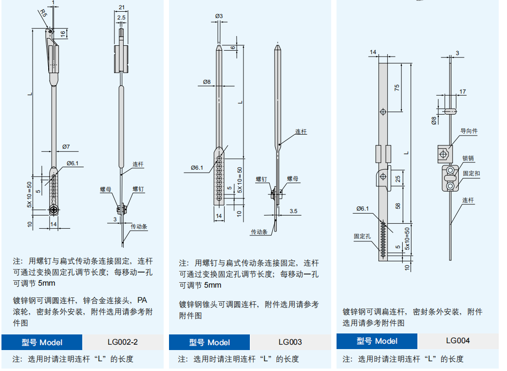 特征说明注:用螺钉与扁式传动条连接固定,连杆 可通过变换固定孔调节长度;每移动一孔 可调节 5mm镀锌钢可调圆连杆,锌合金连接头,PA 滚轮,密封条外安装,附件选用请参考附 件图