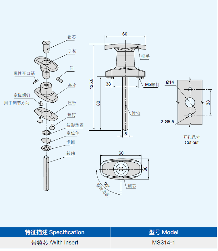 材质:锌合金把手、基座、锁芯,碳钢转轴