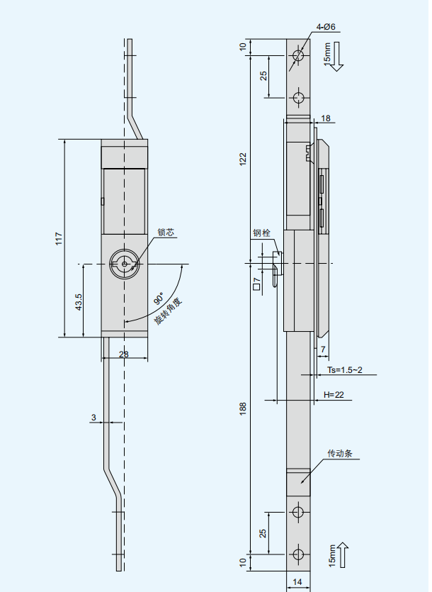 特征说明材质:锌合金锁芯、传动壳,ABS 面板 ( 黄灰 ),碳钢钢栓传动条 ( 或不锈钢 ) 表面处理:镀亮光铬锁芯,镀白锌钢栓、传动壳组件 结构说明:锁芯 90°旋转带动传动壳组件实现开启或 锁闭 备注:默认配 K7010 钥匙