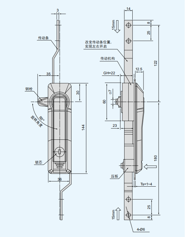 特征说明材质:锌合金基座、手柄、按钮、压板,碳钢钢栓、传动条 表面处理:纳米亚光 ( 或喷黑 ) 基座、手柄、按钮,镀白锌钢栓、传动壳组件 结构说明:快速开启,安装方便快捷;手柄 90°旋转带动传动壳组件实现开启或锁闭 备注:默认配 K0600 钥匙