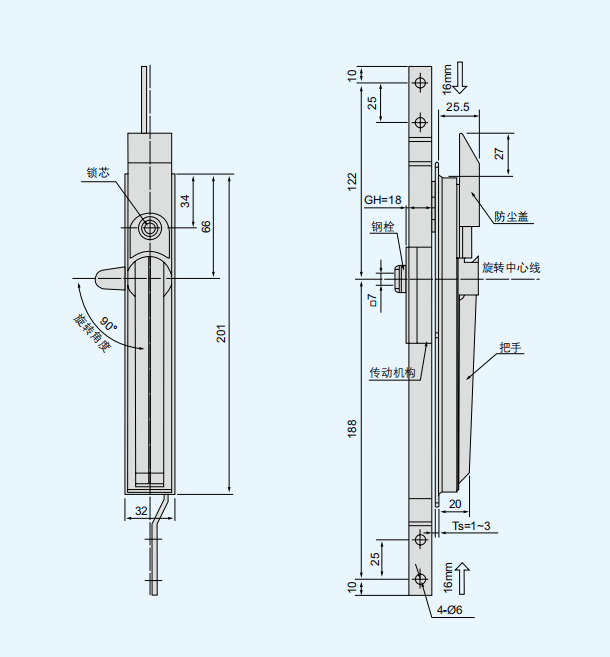材质:锌合金基座、手柄、防尘盖,碳钢钢栓、传动条