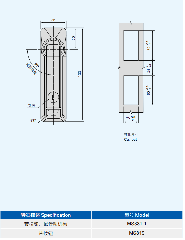 特征说明材质:锌合金基座、手柄、按钮,碳钢钢栓、传动条 表面处理:喷塑(黑淡光)基座、手柄、按钮,镀白锌钢栓、传动壳组件 结构说明:快速开启,安装方便快捷;手柄 90°旋转 带动传动壳组件实现开启或锁闭 备注:默认配 K040 钥匙