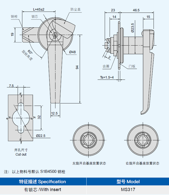材质:锌合金把手、基座、锁芯,碳钢钢栓、齿圈