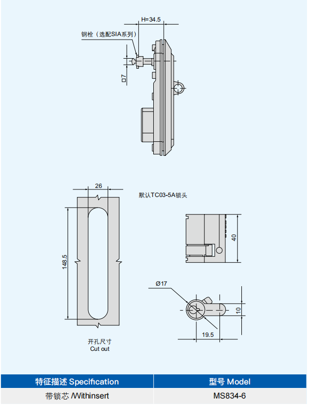 特征说明材质:锌合金基座、手柄锁头组件,碳钢钢栓、转动条 表面处理:喷漆(黑色高耐盐雾)手柄、基座,镀亮光 铬锁头组件结构说明:手柄抬起 45°后可 135°旋转带动传动结构 实现开启和锁闭,调换齿轮齿条位置实现左右开启,可带挂锁 备注:默认 TC03-5A 锁头