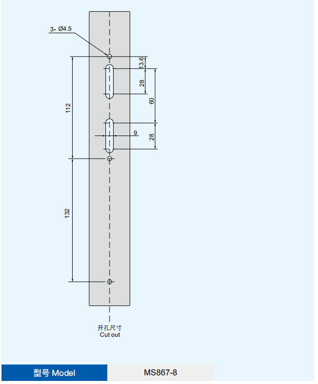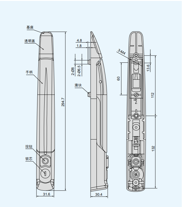 特征说明材质:锌合金基座、手柄、按钮 表面处理:RAL7035 色基座、 手柄、按钮,镀锌滑块 结构说明:旋转钥匙,按下按钮。手柄可自动弹起,从而带动滑块移动,开启门锁 默认钥匙:K14备注:连杆结构参考 MS867