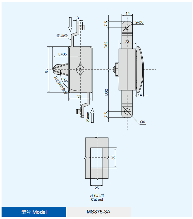 特征说明材质:黑色 PA 面板,锌合金锁芯,碳钢钢栓、传动条 表面处理:镀亮光铬锁芯,镀白锌传动壳组件、钢栓 结构说明:手柄 90°旋转带动传动壳组件实现开启或 锁闭 备注:选配 K15 系列钥匙