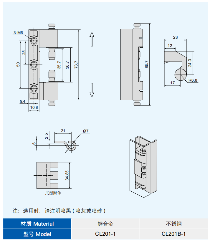 特征说明材质:锌合金铰链,碳钢销子、附件 ( 或不锈钢 ) 表面处理:喷黑 ( 喷灰或喷砂 )、镀锌钢销子及附件 结构说明:可开启角度 110°