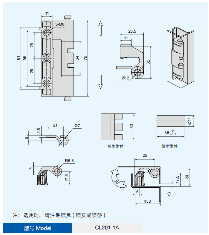 特征说明材质:锌合金铰链 , 碳钢销子、附件 表面处理:喷黑 ( 喷灰或喷砂 ) 镀锌钢销子及附件 结构说明:可开启角度 110°