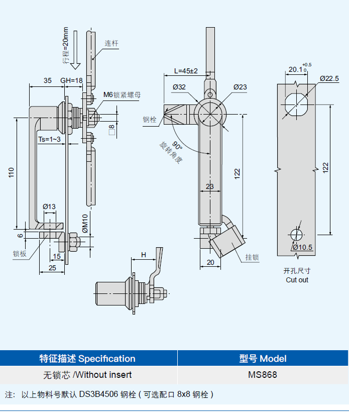 材质:锌合金把手、锁板,基座,碳钢钢栓