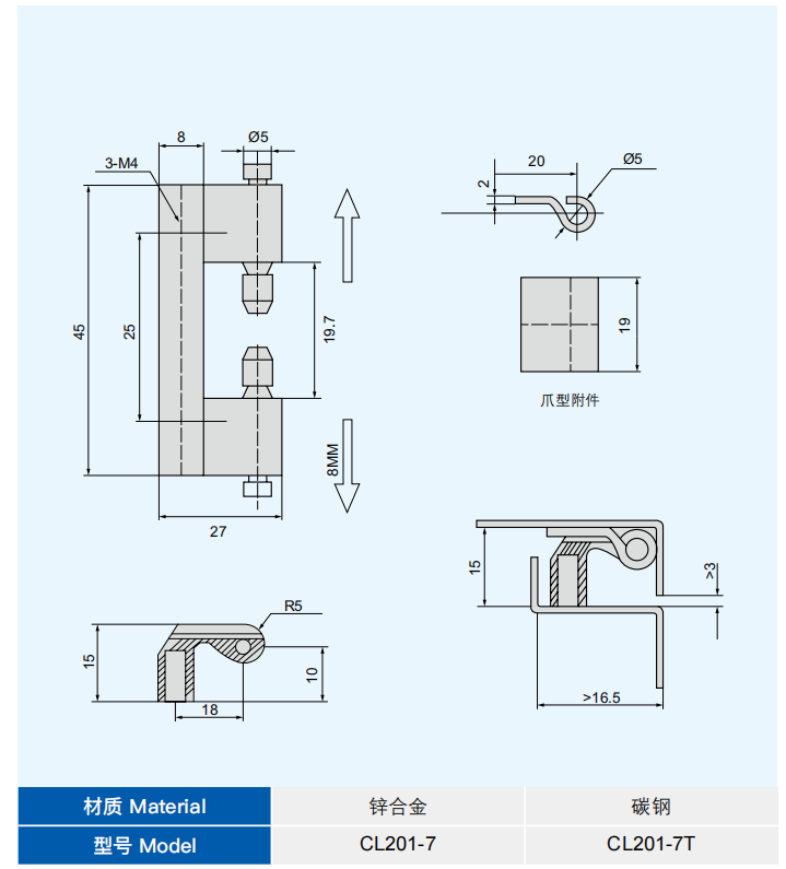 特征说明材质:锌合金铰链,碳钢销子或碳钢铰链,碳钢销子 表面处理:纳米喷涂、亚光、亚黑、镀铬、电涌黑等工艺 结构说明:采用 4# 锌合金,抗强度、扭力、磨损性能强、 耐腐蚀、外观精致