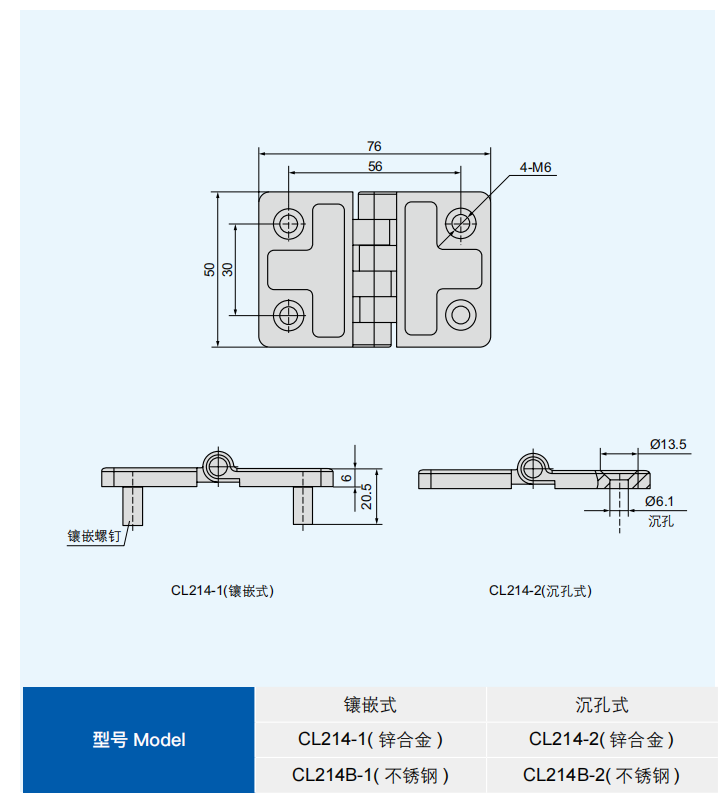 特征说明材质:锌合金铰链、碳钢销子 ( 或不锈钢 ) 表面处理:喷塑 ( 黑淡光 ) 或镀亮铬,镀镍销子 结构说明:可开启角度 180°
