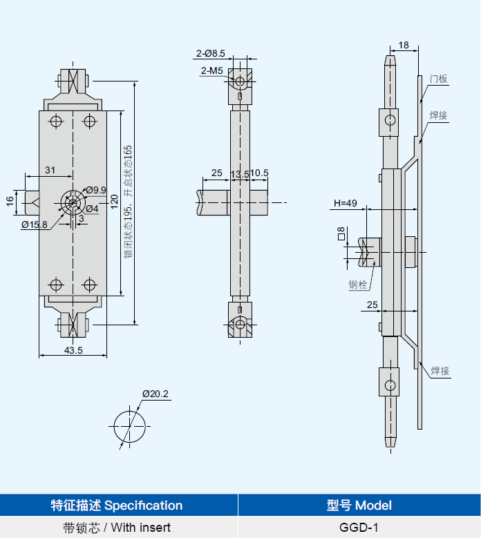结构说明:锁芯90°旋转带动钢栓及连杆三点联动