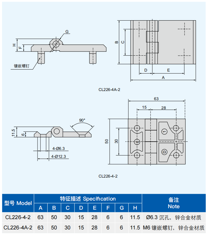 特征说明材质:锌合金铰链,碳钢销子 ( 或不锈钢 ) 表面处理:喷塑 ( 黑淡光 ) 铰链,镀镍销子 结构说明:可开启角度 180°