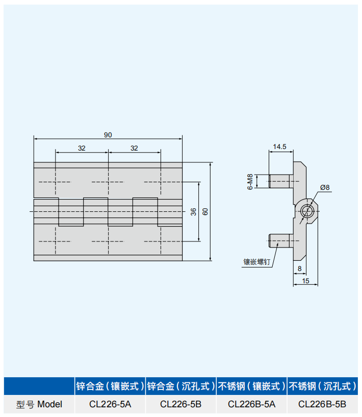 特征说明材质:锌合金铰链、碳钢销子 ( 或不锈钢 ) 表面处理:喷塑 ( 黑淡光 ) 铰链,镀镍销子 结构说明:可开启角度 180°