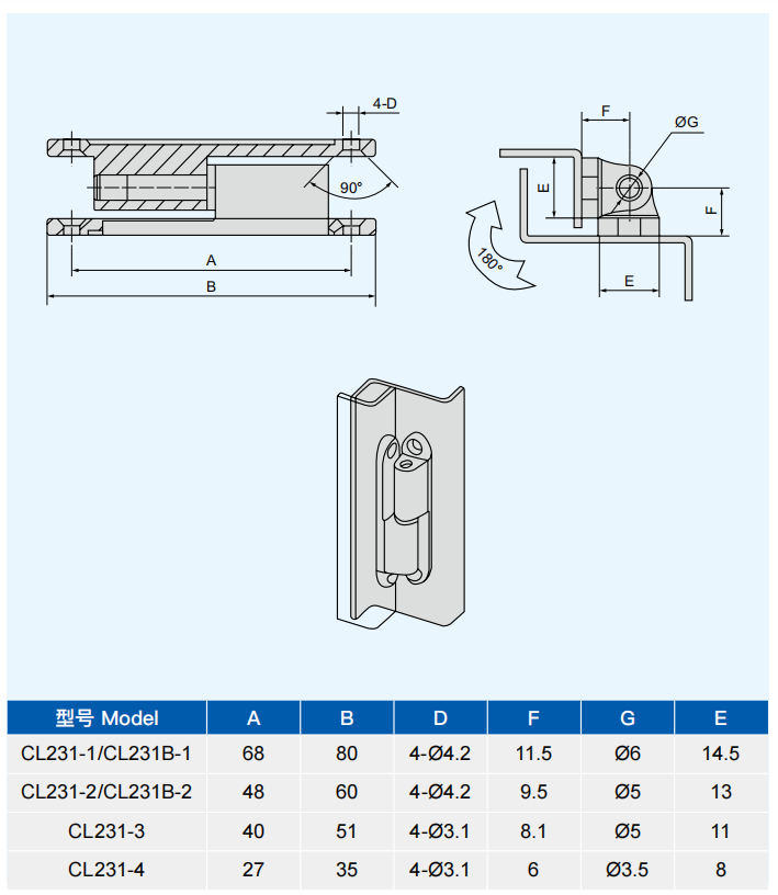 特征说明材质:锌合金 ( 或不锈钢 ) 铰链、碳钢销子、不锈钢垫片 表面处理:镀亮光铬铰链,镀镍销子 结构说明:可开启角度 180°