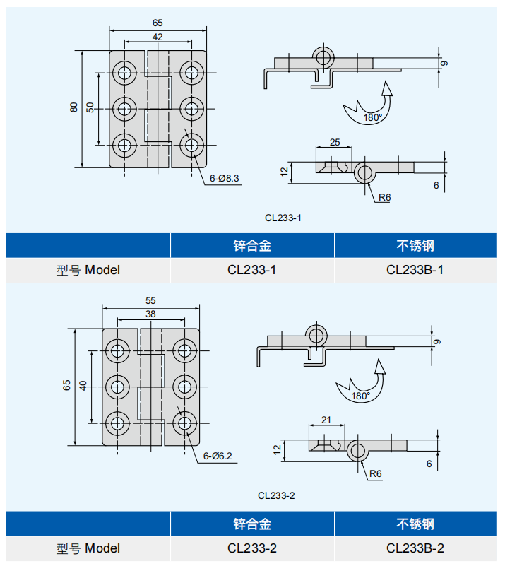 特征说明材质:锌合金铰链,碳钢销子 ( 或不锈钢 ) 表面处理:镀亮铬或喷塑 ( 黑淡光 ) 铰链,镀镍销子 结构说明:可开启角度 180°