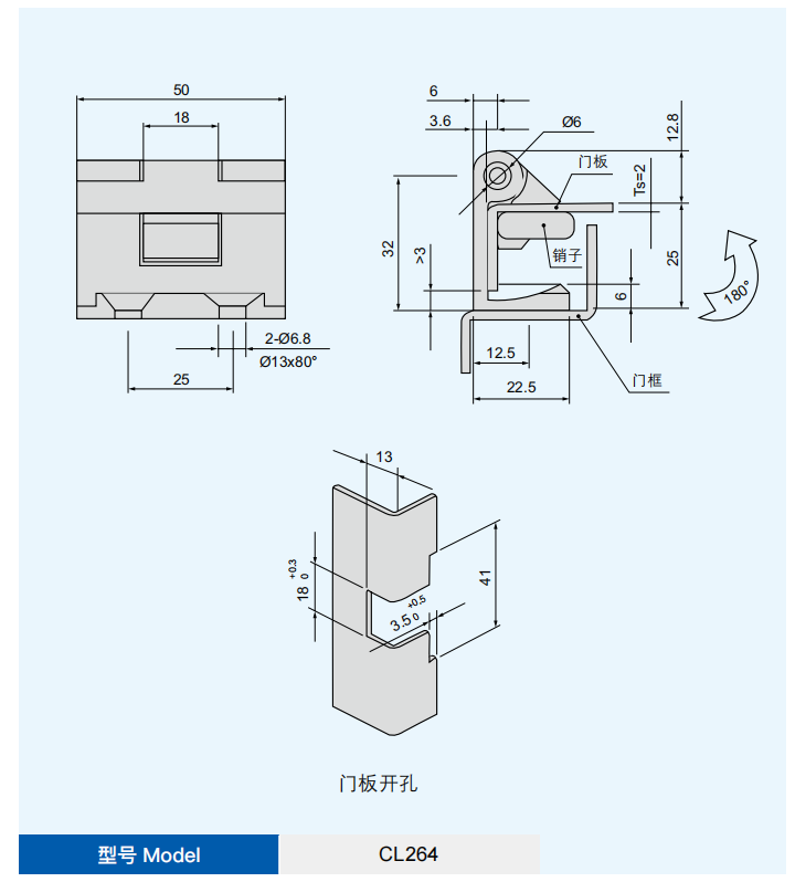 特征说明材质:锌合金铰链,不锈钢垫片,碳钢销子 表面处理:喷塑 ( 黑淡光 ) 铰链,镀镍销子 结构说明:可开启角度 180°