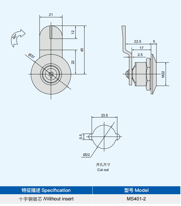 特征说明材质:锌合金基座、锁芯,碳钢钢栓 表面处理:镀亮光铬基座、锁芯,镀白锌钢栓 结构说明:钥匙旋转 90°实现开启或锁闭 备注:默认配 K8180 钥匙