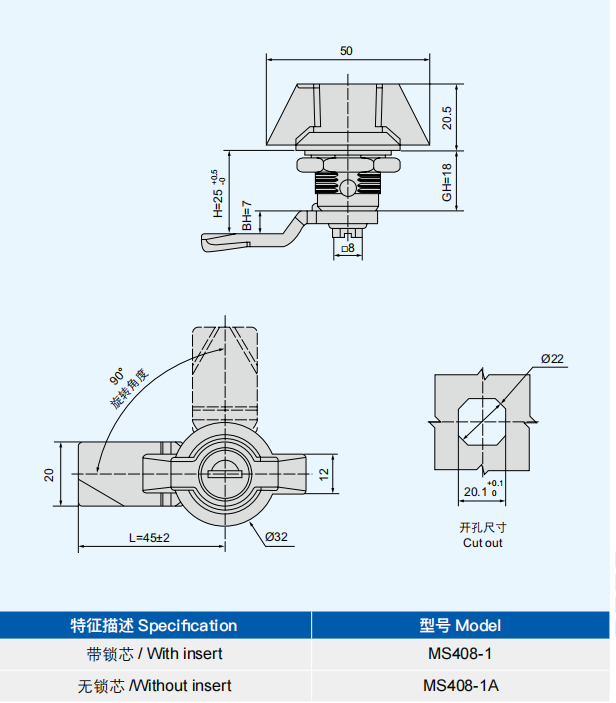 特征说明材质:锌合金基座、手柄,碳钢钢栓 表面处理:喷塑 ( 黑麻面 ) 基座、锁芯,镀白锌钢栓 结构说明:90°实现开启或锁闭 备注:默认配 K333 钥匙