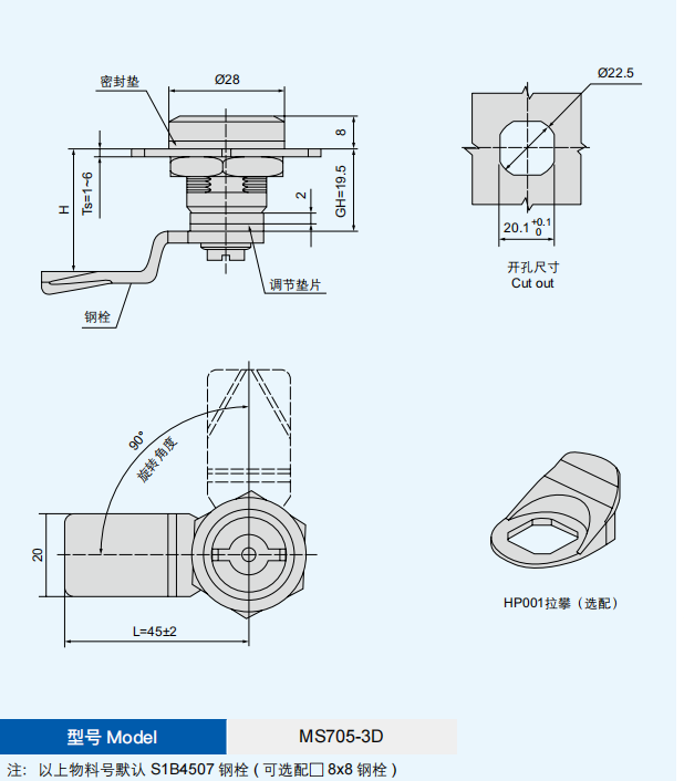 特征说明材质:锌合金基座、锁芯,碳钢钢栓 表面处理:喷漆黑色基座、锁芯,镀白锌钢栓 结构说明:旋转 90°实现开启或锁闭 备注:选配 K15-1A 钥匙