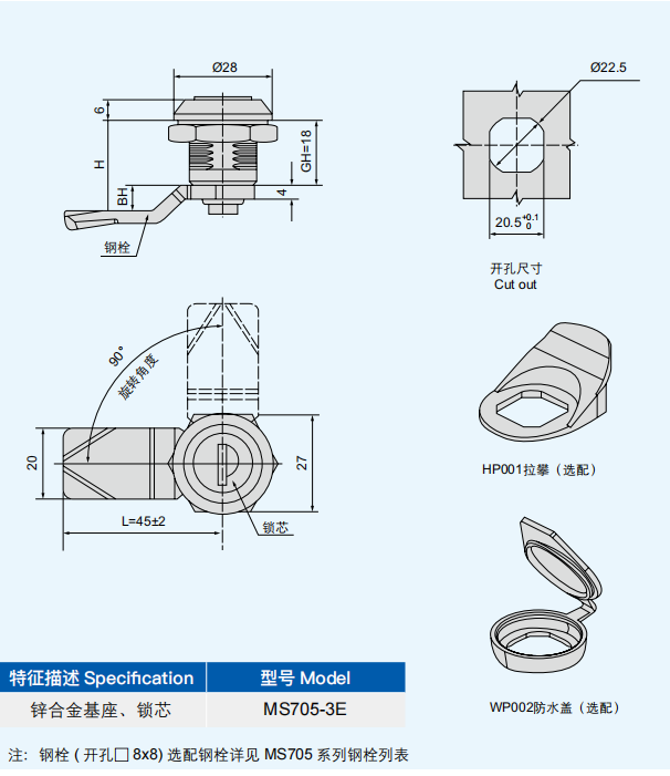 特征说明材质:锌合金基座,碳钢钢栓 表面处理:喷黑或镀亮铬,镀白锌钢栓 结构说明:90°旋转实现开启或锁闭备注:默认配 K333 钥匙
