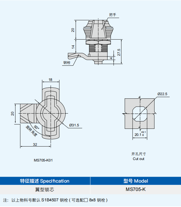 特征说明材质:锌合金把手,基座,碳钢钢栓 表面处理:喷塑 ( 孔雀绿 ) 把手、基座,镀白锌钢栓 结构说明:旋转 90°实现开启或锁闭