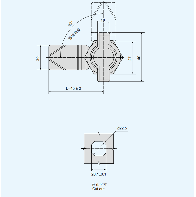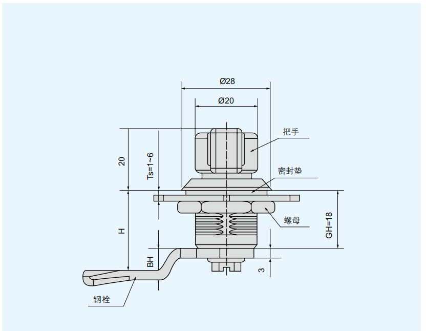 特征说明材质:锌合金基座、PA 手柄 , 碳钢钢栓或全不锈钢 表面处理:喷塑 ( 黑淡光 ) 锌合金基座,镀白锌钢栓 或全不锈钢 ( 本色 )结构说明:把手旋转 90°实现开启或锁闭